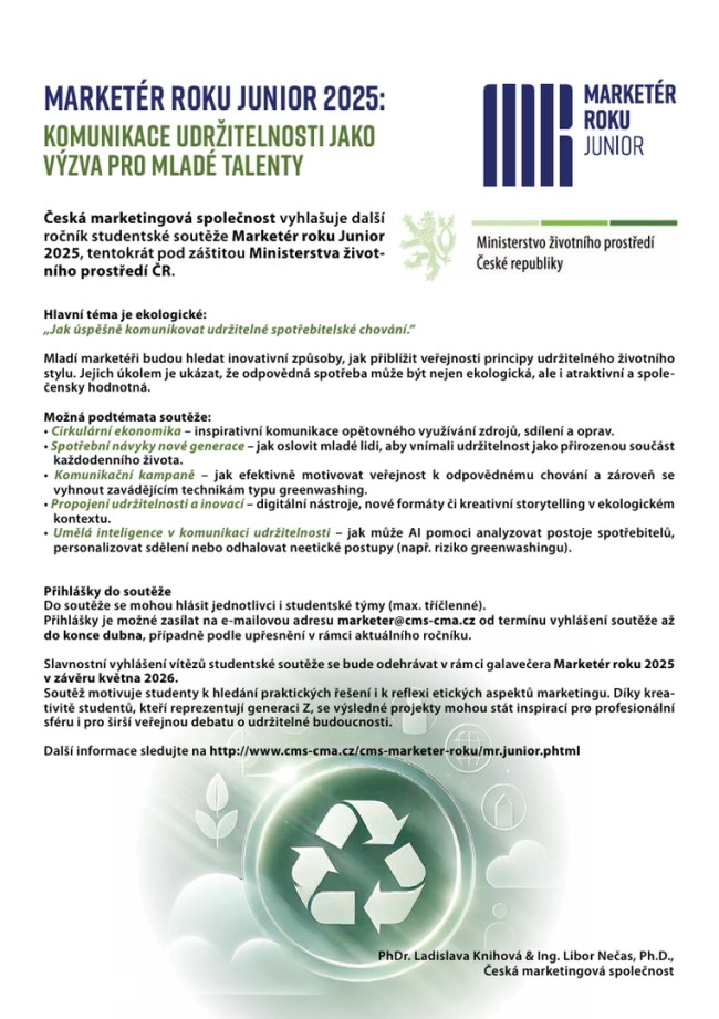 Česká marketingová společnost vyhlašuje čtrnáctý ročník studentské soutěže Marketér roku Junior 2025, tentokrát pod záštitou Ministerstva životního prostředí ČR. Záštitu nad soutěží přijal ministr životního prostředí Petr Hladík, který osobně podporuje zapojení mladých talentů do komunikace udržitelnosti.