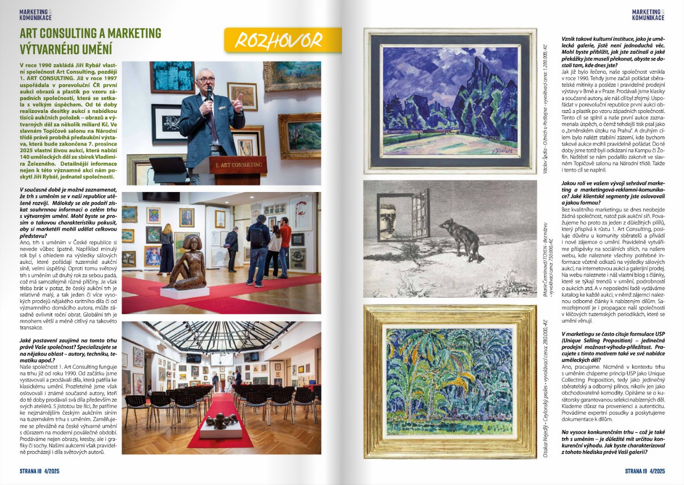 Bez kvalitního marketingu se dnes neobejde žádná společnost, natož pak aukční síň. Považujeme ho proto za jeden z důležitých pilířů, který přispívá k růstu 1. Art Consulting, posiluje důvěru u komunity sběratelů a přivádí i nové zájemce o umění. Pravidelně vytváříme příspěvky na sociálních sítích, na našem webu, kde naleznete všechny potřebné in formace včetně odkazů na výsledky sálových aukcí, na internetovou aukci a galerijní prodej. Na webu naleznete i náš vlastní blog s články, které se týkají trendů v umění, podrobností o aukcích atd. A v neposlední řadě vydáváme katalog ke každé aukci, v němž zájemci naleznou odborné články k nabízeným dílům. Samozřejmostí je i propagace naší společnosti v klíčových tuzemských periodikách, které se umění věnují.